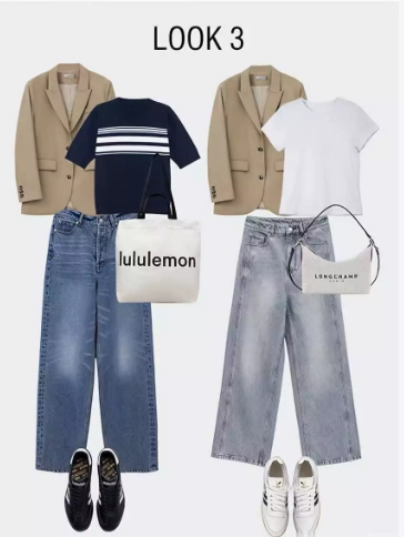 الإطلالة 3: سترة كاكي مع بنطال جينز واسع الساقين أنيقة ومريحة. يُضفي اللونان الكاكي والأزرق المتباينان إطلالة رقيقة وجذابة. يُضفي بنطال جينز رمادي لمسة فريدة.